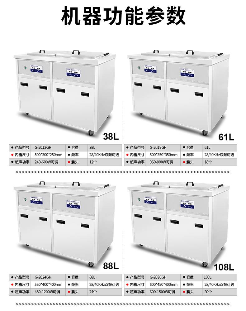 产品详情:歌能G-2012GH双槽多槽超声波清洗机38l多功能清洁机;高能标准系列大型工业超声波清洗机,智能双重规划,清洗更轻松!工业动力,除油,除锈,除蜡,松香除尘,除尘均在一台机器上完成。尽一切尽力使清洁更清洁。